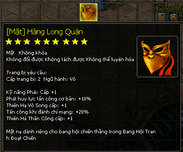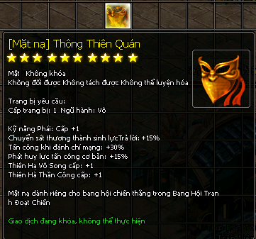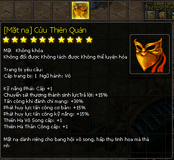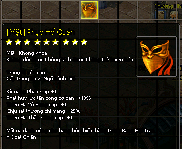 Quân Lâm Miện (Mặt Nạ xu cổ) Kỹ năng môn phái: Cấp +1 Kinh nghiệm đánh quái: +20% -> Phát huy lực tấn công cơ bản: +5% Thiên Hạ Vô Song:+1 Thiên Hà Thần Công: +1 Tấn Công Khi Đánh Chí Mạng: +5% -> 10% |
