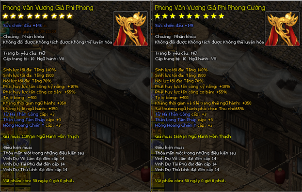 - Phong Vân Phi Phong có thể dùng Linh Thạch hoặc Hồn Thạch để cường hóa, số lượng Linh Thạch/Hồn Thạch tiêu hao được tính theo công thức cũ.