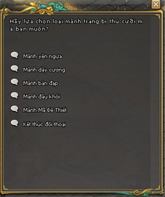 Vật phẩm nhận ngẫu nhiên 1 Thần Sa Phong Vân Dẫn (cấp 3) 1 Thần Sa Kình Tiếu Dẫn (cấp 4) 1 Thần Sa Kình Tiếu Dẫn (cấp 5) 1 Tọa Kỵ Cường Hóa Thạch