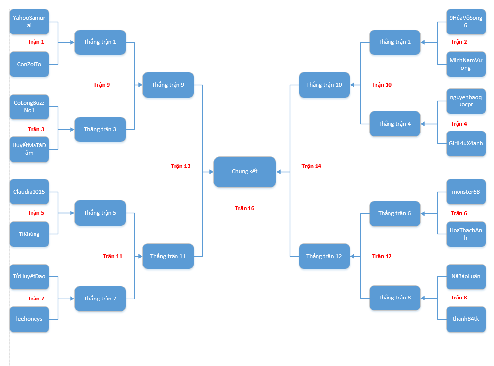 | 7 | TửHuyệtĐạo | leehoneys | 14h00 | Đấu trường 2 |