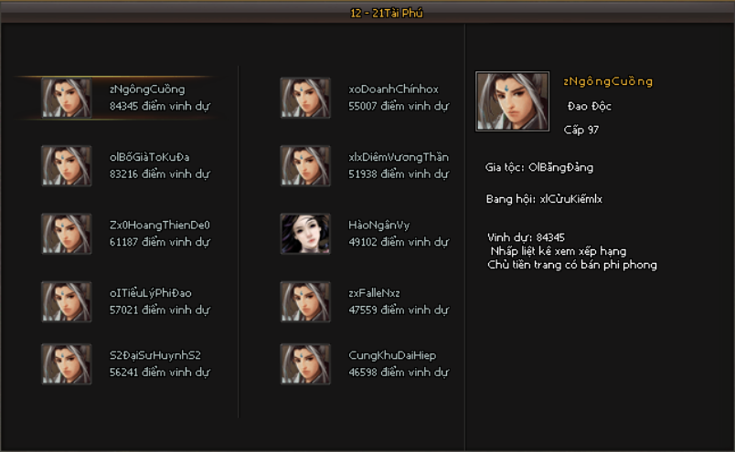 Khép lại thời gian đua Top Tài Phú, Bổn Trang xin công bố Top 10 Tài Phú tại máy chủ mới Danh Kiếm. Chúc mừng quý nhân sĩ, Bang hội đã nhận được phần thưởng của sự kiện, thời gian trao thưởng được công bố trong những bản tin tiếp theo, quý nhân sĩ đón theo dõi tại trang chủ.