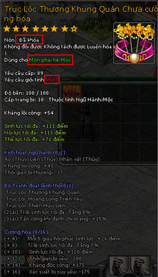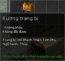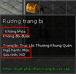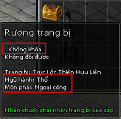 - Khi đồng đạo nhận thưởng được Rương trang bị không khoá, có Ngũ hành và Giới tính (Môn phái), thì khi nhấn chuột phải sẽ nhận được trang bị khoá tương ứng với Ngũ hành và Giới hính (Môn hhái) của trang bị đó.
