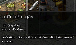 | 1 Lưỡi kiếm gãy + 1 Chuôi kiếm + 1 Mảnh kim tê | 500 Bạc (không khóa) | 1 Trường kiếm |