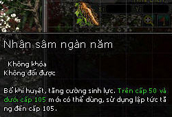 - Nhân sâm ngàn năm là vật phẩm quý hiếp bổ khí huyết, tăng cường sinh lực, giúp nhân vật từ cấp 50 trở lên có thể ngay lập tức đạt đến đẳng cấp 105. Vì thế, Nhân sâm ngàn năm chỉ dành cho nhân vật từ đắng cấp 50 cho đến dưới 105 sử dụng.