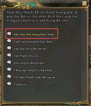 - Nhân vật thuộc bang báo danh thành công thông qua NPC Tướng Viễn Chinh Thiết Phù để tiến vào đảo Anh Hùng. Sau đó gặp NPC Truyền tống thiết phù để vào khu chuẩn bị