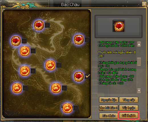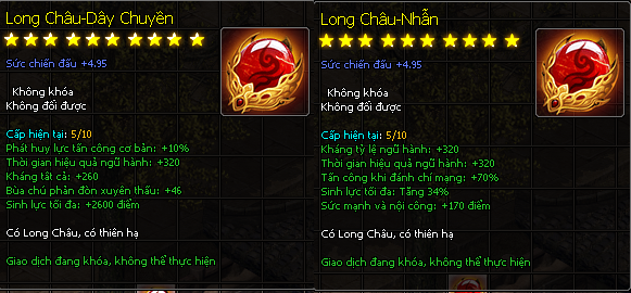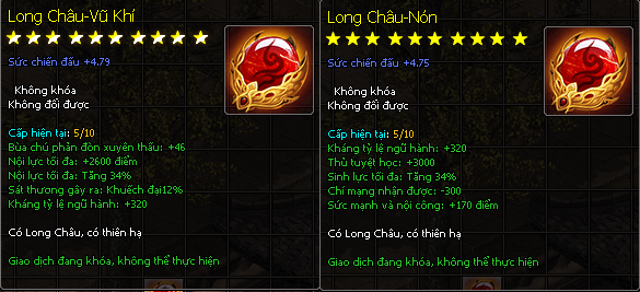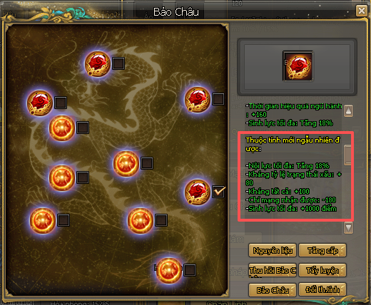 - Khi nâng lên Long Châu, sẽ được thêm ngẫu nhiên một thuộc tính mới và giữ nguyên các thuộc tính cũ của Bảo Châu.