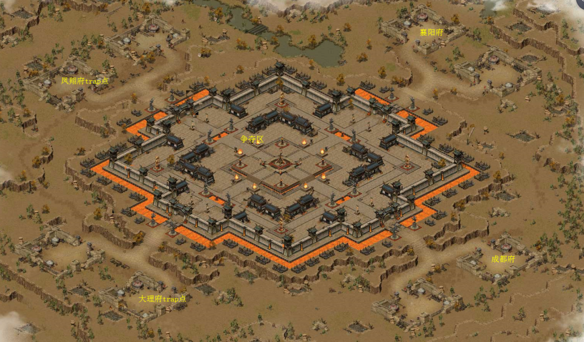 - Cổng thành: Nội thành Đại Hoàng Cung bị phong bế; có 4 cổng thành chắn lối. Mỗi Bang tương ứng một cổng; phá vỡ cổng mới vào được nội khu. Nếu là bên thủ, cổng thành không làm mới.