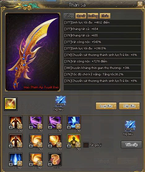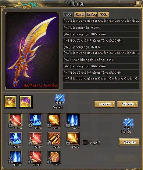 - Sau khi tăng 10 thuộc tính của vũ khí Thần Sa Vô Cực lên mức cao nhất (cấp 90), thì có thể tiến hành nâng cấp từ Hạo Thiên lên Long Tuyệt (có tỷ lệ thành công hoặc thất bại).