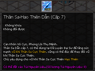 - Nâng vũ khí Thần Sa Hạo Thiên lên Long Tuyệt cần 30 Thần Sa-Hạo Thiên Dẫn (Cấp 7).