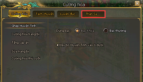 - Gặp NPC Dã Luyện Đại Sư chọn phần Thần Sa và gắn Vũ Khí Thần Sa vào ô tương ứng để nâng cấp.